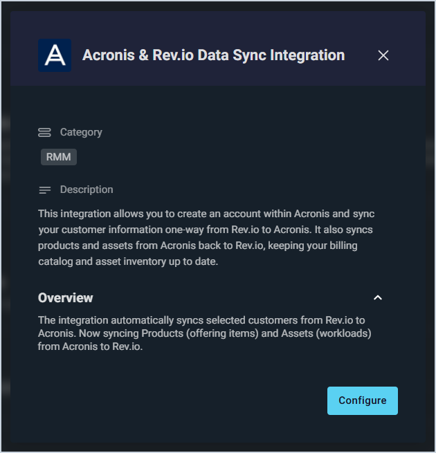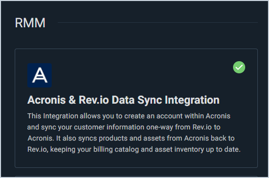 - The Acronis integration is unlike other integrations with Rev.io and requires you to work with our sales team to get set up with Acronis. NOTE: If you do not work with our sales team, this integration may not work correctly.