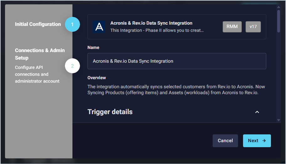 - The Initial Configuration section is automatically populated. You can review URLs and add API Keys in the Trigger Details section if needed. When finished, click the Next button.