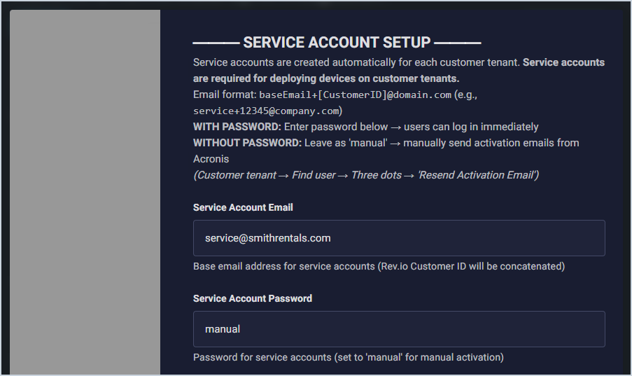 If you want the same password set for all of your service accounts, enter that password in the Service Account Password field. To configure devices for a customer, login to Acronis using the base email plus their Rev.io Customer ID and the default Service Account Password. Alternatively, if you want to use a unique password for each service account, leave manual in the Service Account Password field. To login and configure devices for a customer, you'll need to manually send the activation link using an admin account by accessing the customer in Acronis, clicking My Company, locating the service account user, clicking the 3-dot icon, and clicking Resend Activation Email. You can also always set a default password in the Service Account Password field and change it later using the same process to resend the activation email.