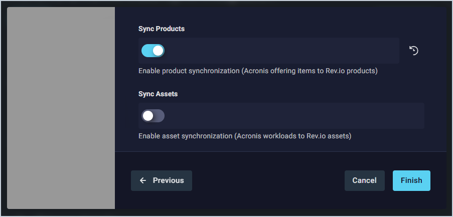 - If you want to sync Acronis offering items with Rev.io products, click the Sync Products option. If you want to sync Acronis workloads with Rev.io assets, click the Sync Assets option. Then, click the Finish button.