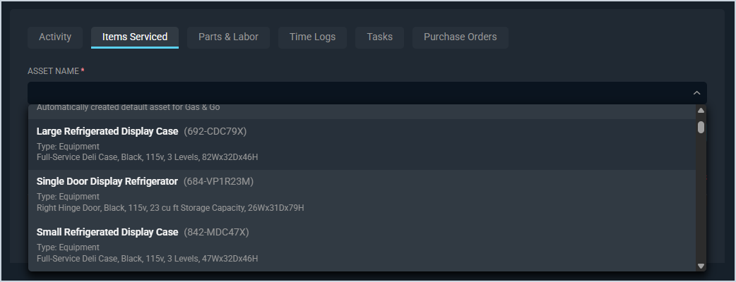- View previously entered assets in the lower portion of the tab. See the Ticket Details: Items Serviced Tab article for more information.