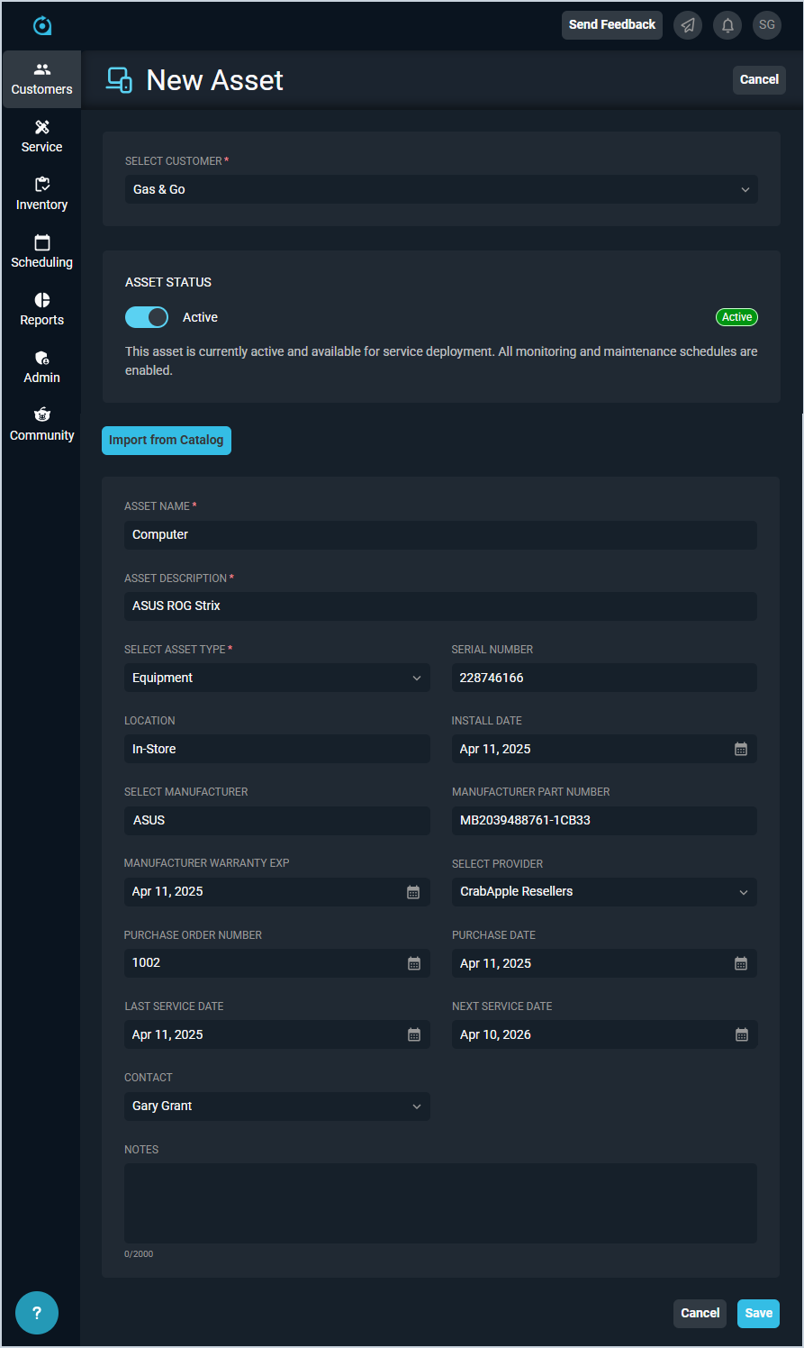 - Import some details for the asset from the product catalog and avoid duplicating all the item's details manually by clicking the Import from Catalog button. See the Add/Edit Assets - Import from Catalog article for more information.