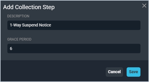 The 1-Way Suspend collection step allows you to set a reminder to suspend the customer as part of your collection efforts, including a specified grace period.