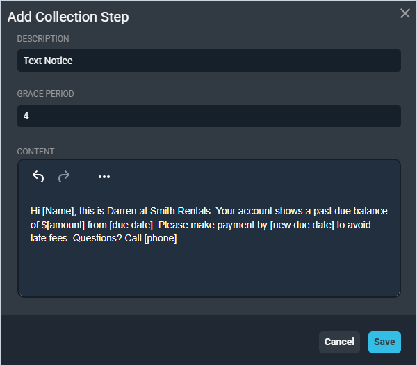 The Text Message collection step allows you to set a reminder to text the customer to attempt a collection, including a specified grace period.