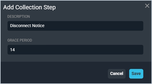 The Disconnect collection step allows you to set a reminder to disconnect the customer as part of your collection efforts, including a specified grace period.