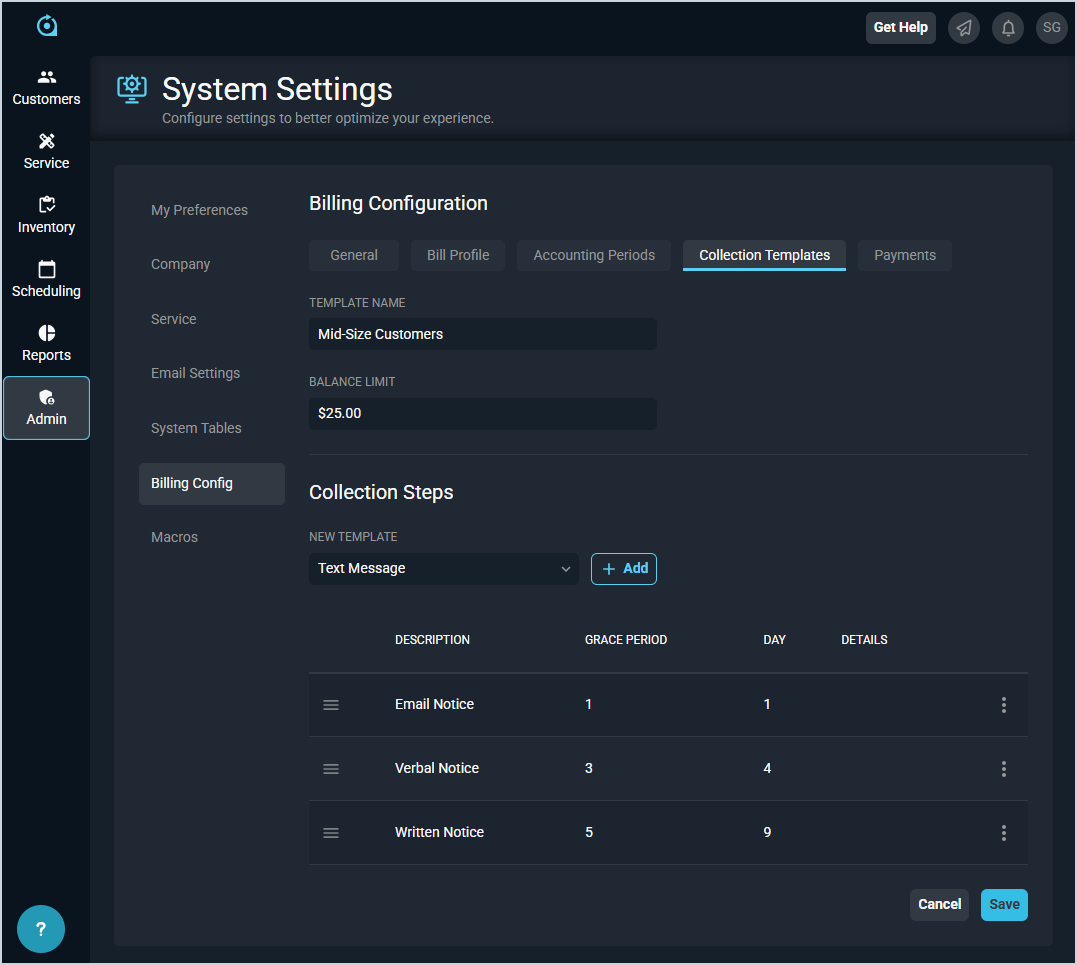 The Collection Templates tab in the Billing Config category on the System Settings screen allows you to define various collections templates in your database. These templates are comprised of reminders for various tasks to attempt to collect from your customers, including emails, phone calls, letters, text messages, etc.