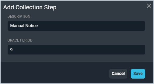 The Manual collection step allows you to set a reminder to take a manual action to attempt a collection, including a specified grace period.