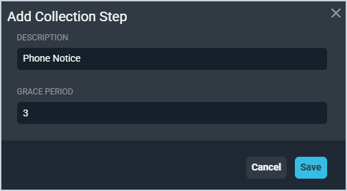 The Phone Call collection step allows you to set a reminder to call the customer to attempt a collection, including a specified grace period.