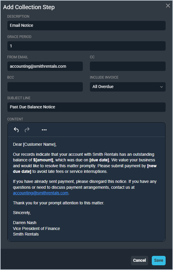 The Send Email collection step allows you to set a reminder to send an email to the customer as part of your collection efforts, including a specified grace period.