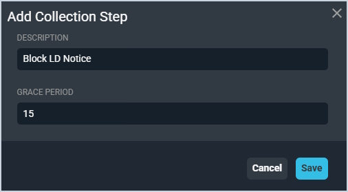 The Block LD collection step allows you to set a reminder to place an LD Block on the customer as part of your collection efforts, including a specified grace period.