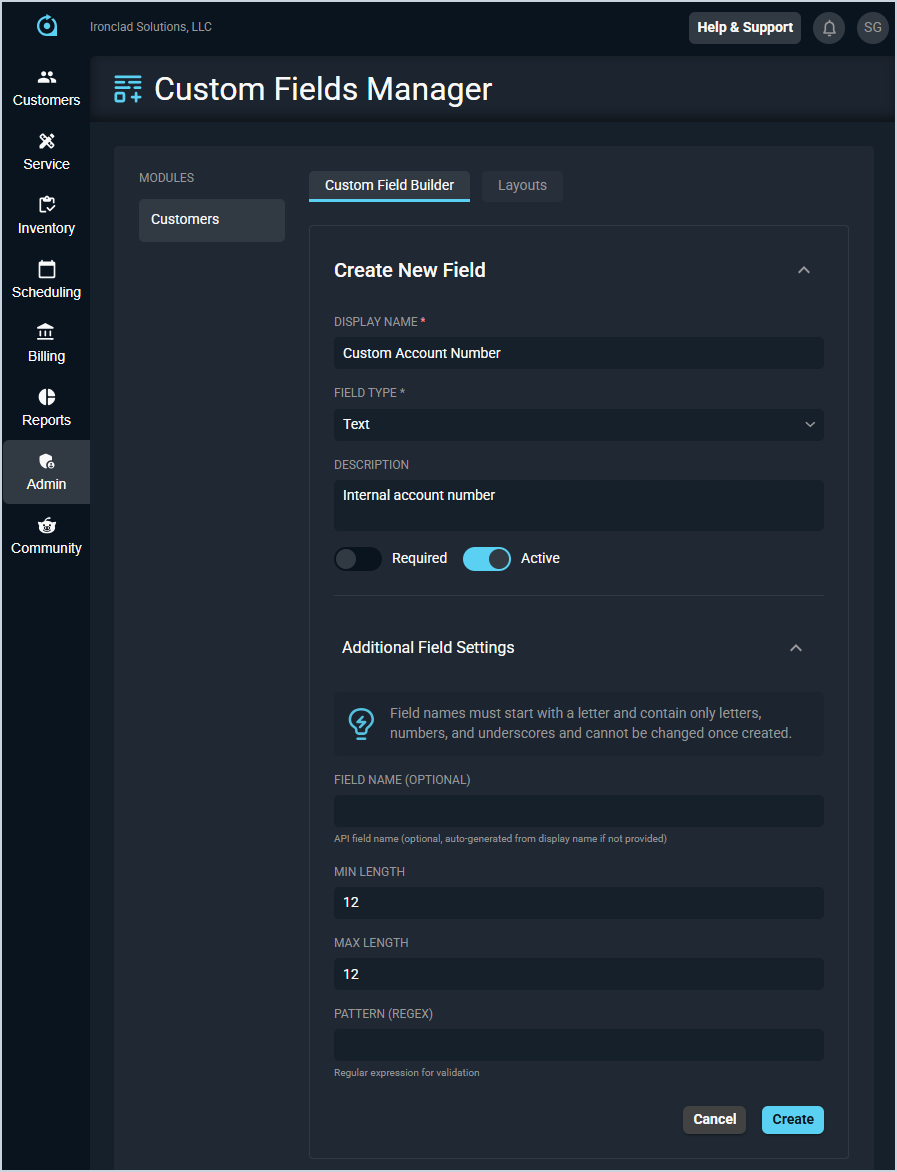| 9 | Pattern (Regex) | Regular expression pattern for the custom field. |