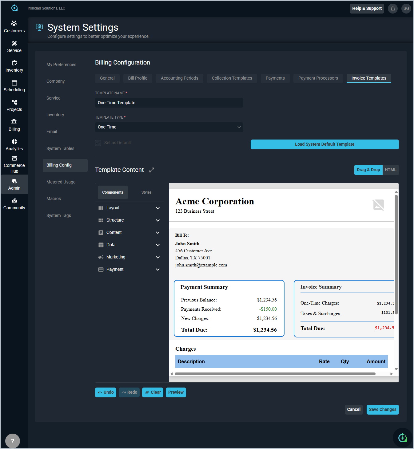 The Invoice Templates tab in the Billing Config category on the System Settings screen allows you to create and manage the templates used to generate invoices for your customers. Templates can be configured as one-time or recurring to match your billing needs, and you can set one default template for each type. See the Customizing Invoice Templates article for more information about the specific options available when creating and editing invoice templates.