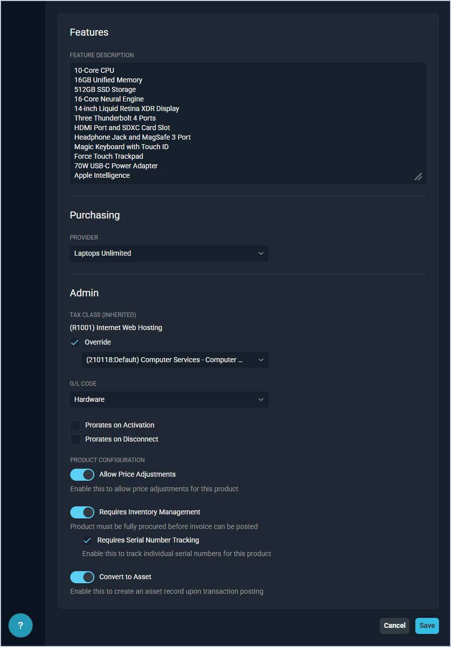 | 14 | Provider | Provider for the product. See the System Settings: System Tables - Product Catalog article for more information on configuring provider options. |