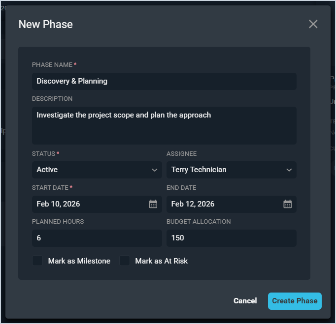The Add Phase button on the Overview tab allows you to break a project into clear, manageable phases. Phases help organize work by grouping related tasks, tickets, and time, making it easier to track progress and understand where each part of the project stands.