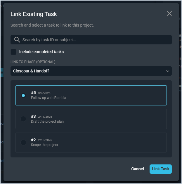 Simply search for and select the specific task you want to link to the project, select the appropriate phase from the Link to Phase dropdown, and click the Link Task button to add an existing task to the project.