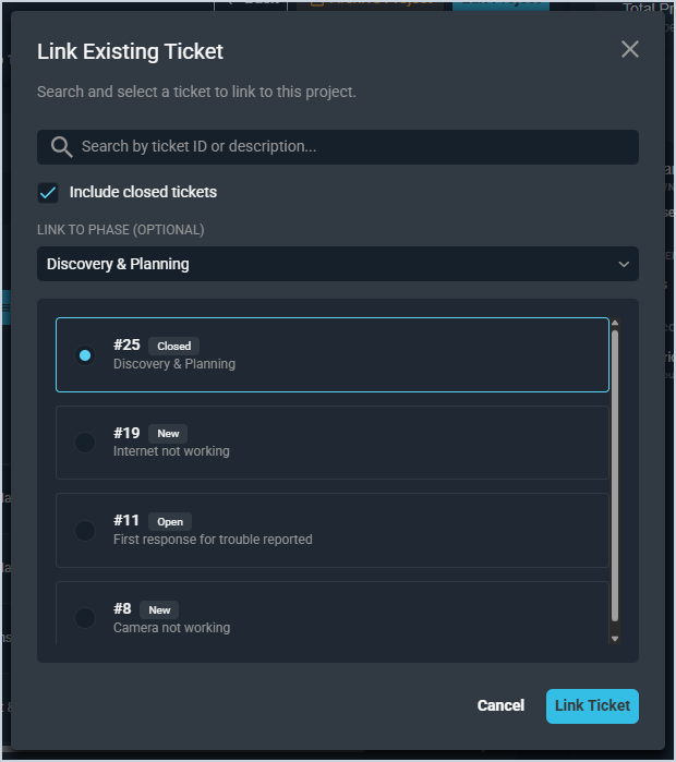 Simply search for and select the specific ticket you want to link to the project, select the appropriate phase from the Link to Phase dropdown, and click the Link Ticket button to add an existing ticket to the project.