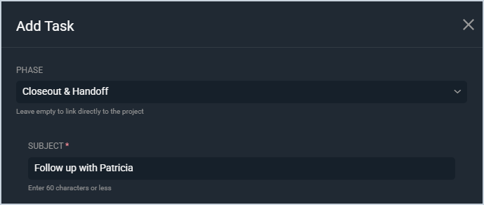 See the Create/Edit Calendar Items article for more information on creating tasks. Tasks created from the Work tab on the Project Details screen are automatically linked to the project. Additionally, when creating the task, simply select the appropriate project phase from the Phase dropdown to link the task to a specific phase of the project.