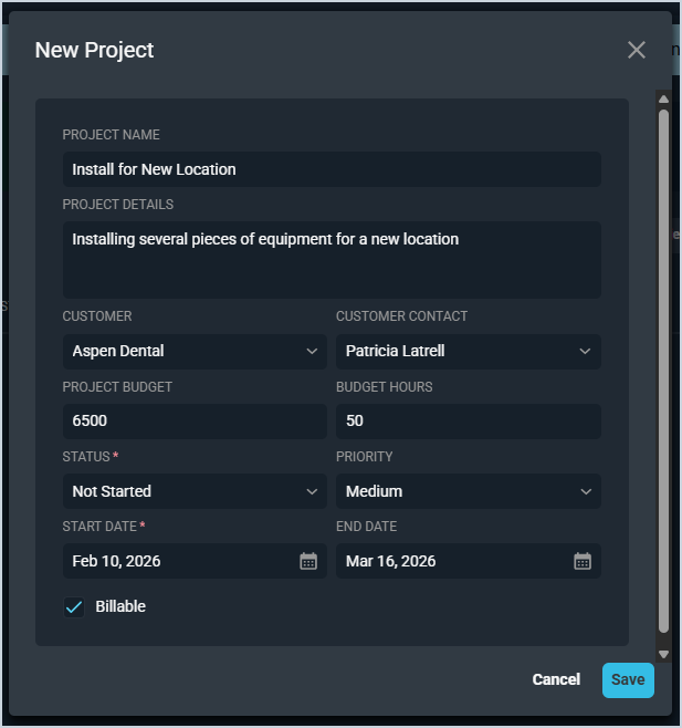 | 11 | Billable | Check this option to indicate the project is billable. |