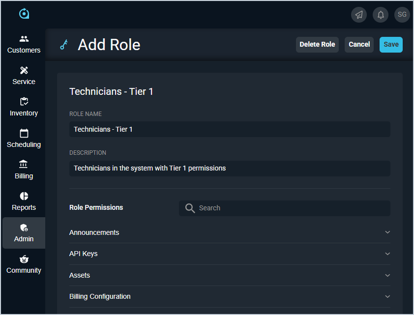 | 6 | Role Permissions | Select whether users in the role can perform certain actions. NOTE: A user cannot have every permission available in the system unless they are a global administrator. For information on permissions in Rev.io PSA, see the Available Permissions article. |