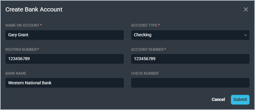 The Add Bank Account button allows you to add a bank account for future payments on the customer's account.