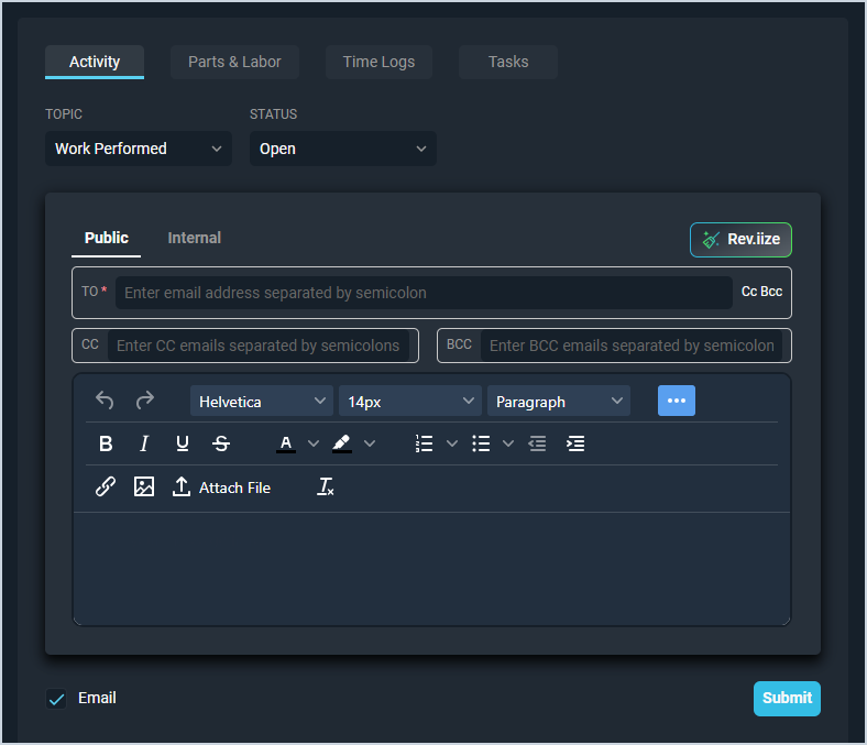 | 5 | To/CC/BCC | Email addresses where the ticket activity item will be sent. This field is only visible if the ticket activity item is set to Public and the Email option is checked. | |