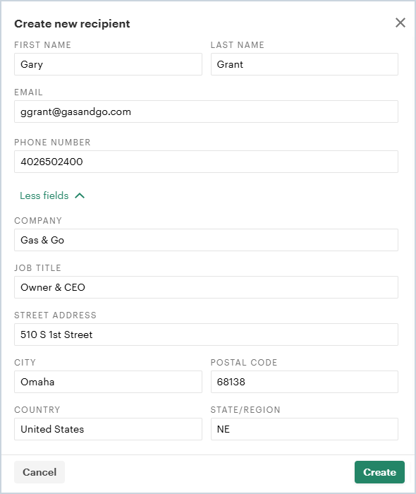 Click the Create button to create the recipient. Newly created recipients are automatically added to the quote.