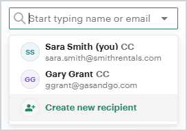 If you've already sent a quote to a specific recipient before, simply search their name or email in the dropdown and select them from the list. If you're sending a quote to someone for the first time, click in the dropdown field and select the Create New Recipient option.