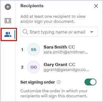 To add recipients for the quote, access the Recipients panel by clicking the people icon on the right side of the quote.