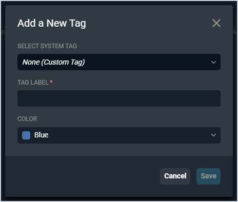 There are 2 options available for adding tags: selecting from preconfigured system tags added on the system settings screen or entering new information for a tag specific to the customer. See the System Settings: System Tags article for more information about creating system tags to select from the dropdown. To add tags manually, simply enter the text you want to display in the Tag Label field and select a Color from the dropdown.