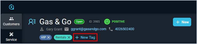 Adding a tag to a customer profile is as easy as clicking the New Tag button at the top of their customer profile.