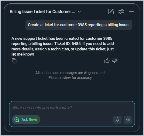 To use Ask Revii, simply type your question or request in natural language, such as "Create a ticket for customer 3985 reporting a billing issue." Revii will guide you through the process or complete the action for you when possible.