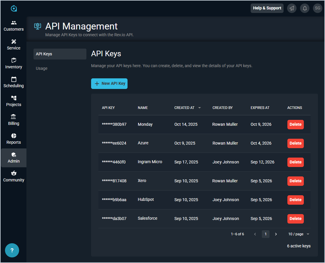 The API Keys list view allows you to create, view, and delete various API keys for your Rev.io instance. An API key is a unique identifier that allows secure communication between your Rev.io platform and other applications.