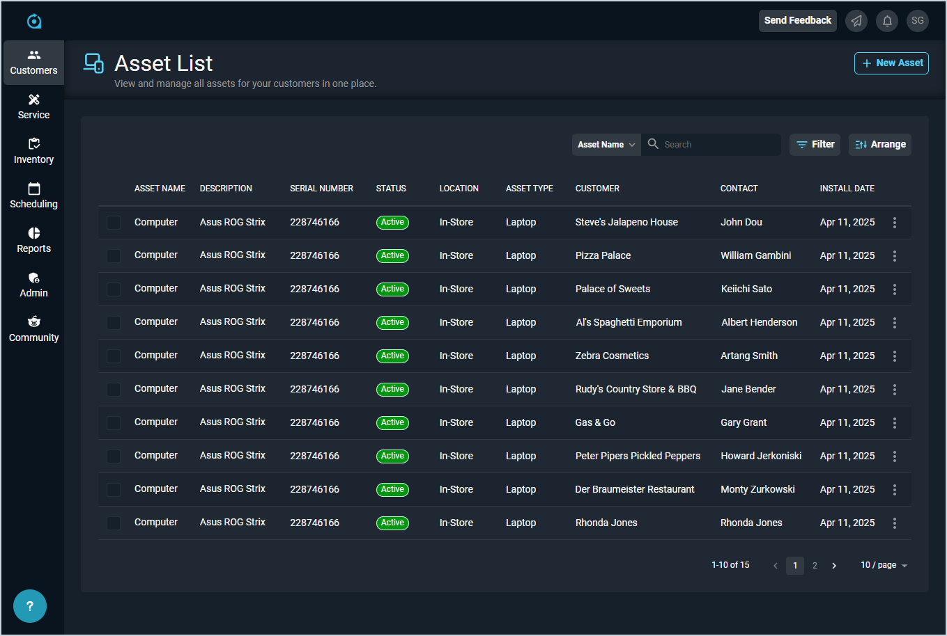 The Asset List view displays every asset in your database. 'Assets' in Rev.io PSA are items the customer owns or leases that you service or monitor. These items can include physical equipment, like PCs, laptops, and monitors; digital licenses, like Office 365, Pax8, and Acronis; and telecom assets, like telephone numbers and SIM cards.