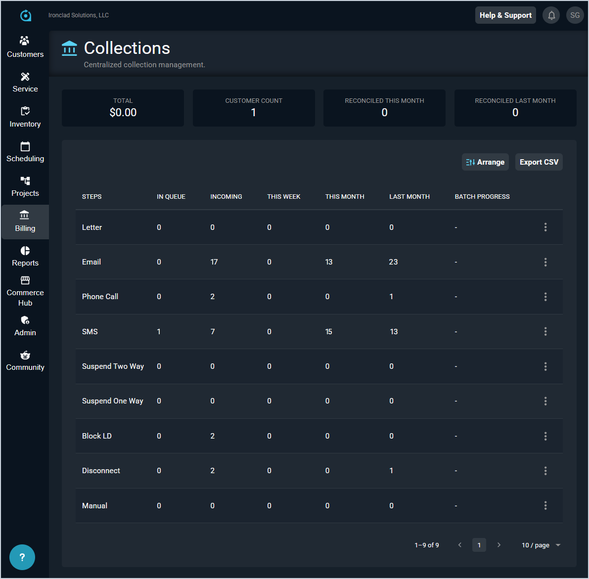 - View the Total dollar value of the collection items in the queue, the Customer Count for the number of customers in the collection queue, the number of collections Reconciled Last Month, and the number of collections Reconciled This Month using the tiles at the top of the screen.