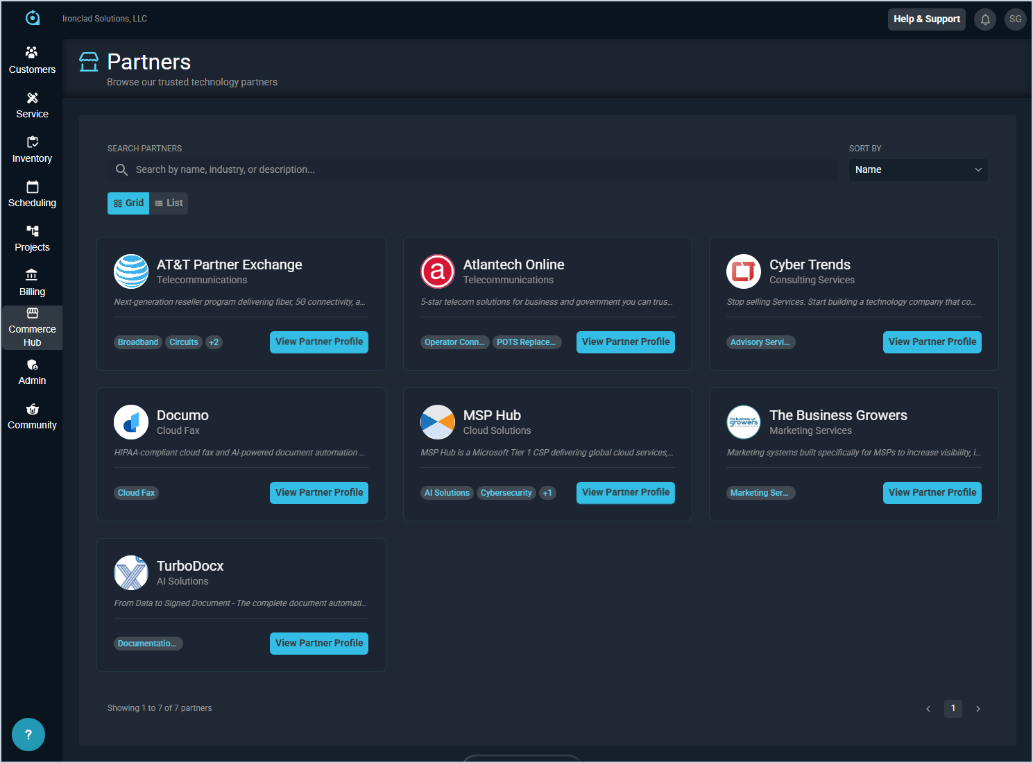 The Commerce Hub module allows you to browse and search technology partners, explore their products and services, and contact them directly, all from one centralized storefront. In future releases, the Commerce Hub will expand to support direct purchasing within the platform, syncing products with customer accounts, and managing products directly in the system, making it easier to discover, buy, and operationalize the tools your business relies on, all in one place.