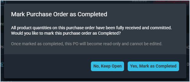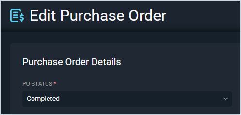 Completing a purchase order effectively closes it, preventing any additional items from being added while keeping the order available in read-only mode for historical reference. A purchase order can only be completed once all items on the order have been received.