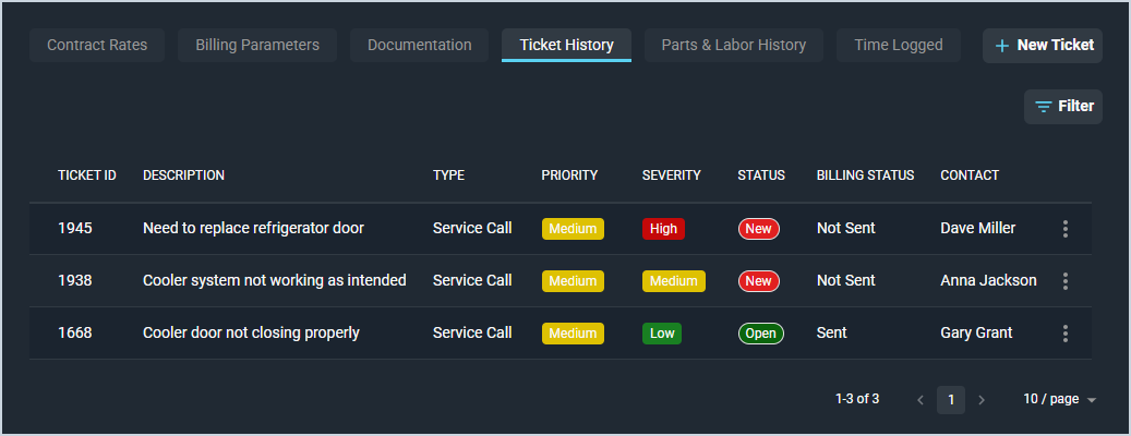 The Ticket History tab on the Contract Details screen displays every ticket created tied to the specific contract. This tab allows you to review a log of work you've completed and the services you've provided for the contract.