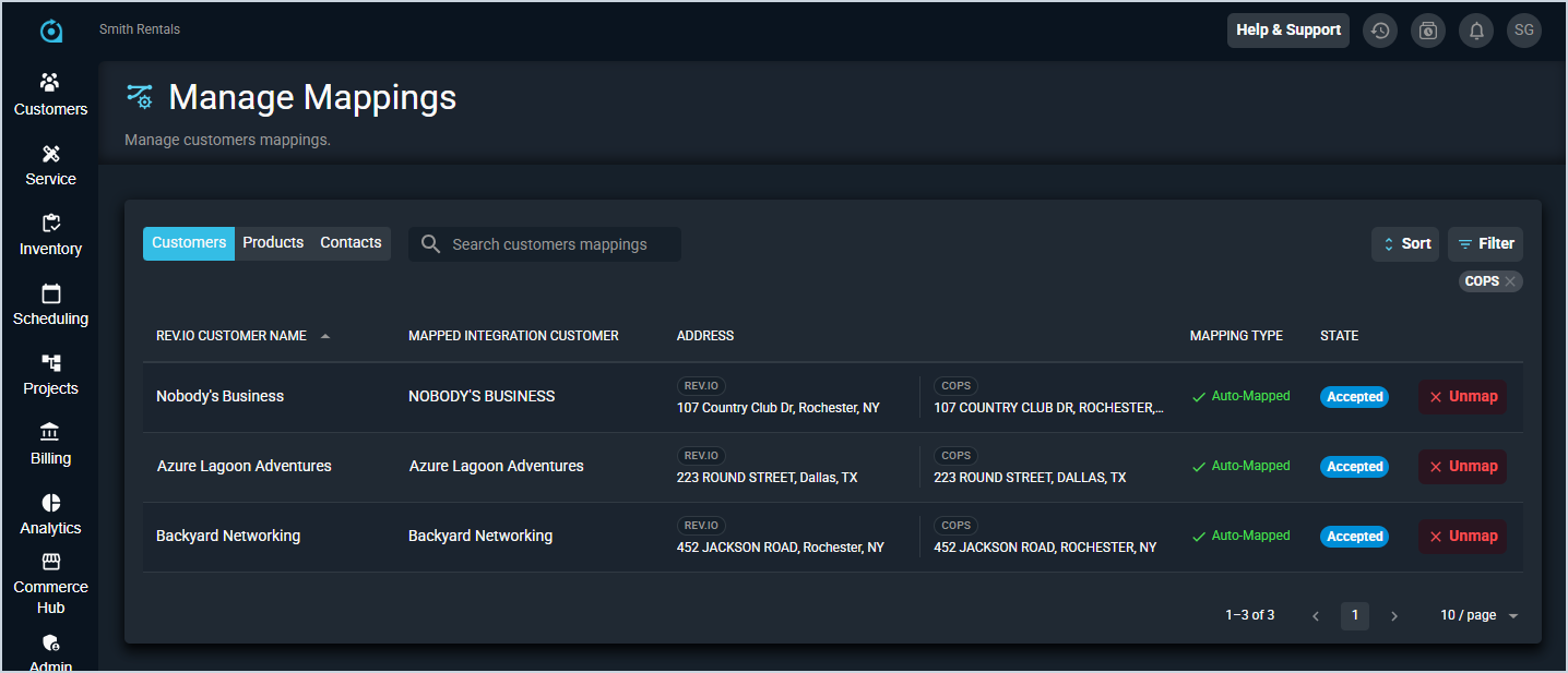 - To deactivate a customer's COPS sync, click Admin > Integrations Library > Marketplace tab > COPS > View Mappings button in the upper right hand corner. Click the Filter button and select COPS from the Integration System dropdown. Then, click the Unmap button next to any customers you want to unsync.