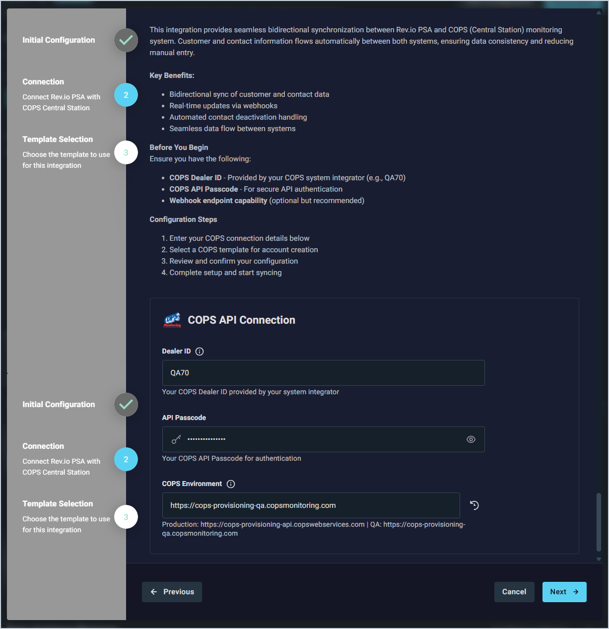 - In the COPS API Connection section, enter your Dealer ID, API Passcode, and COPS Environment URL. Then, click the Next button.