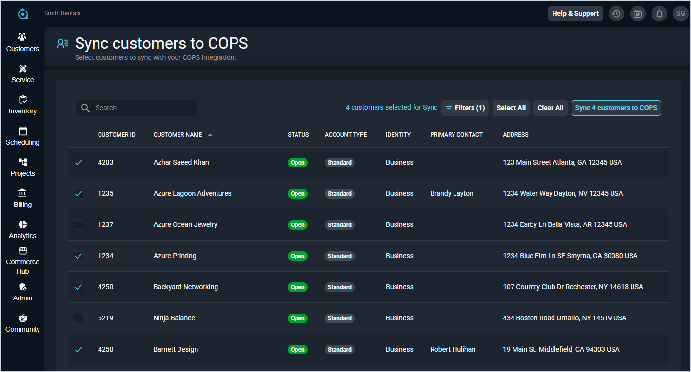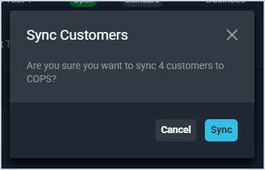 - Select the customers you want to sync with COPS and click the Sync customers to COPS button. You'll receive an in-app notification when the sync is complete.