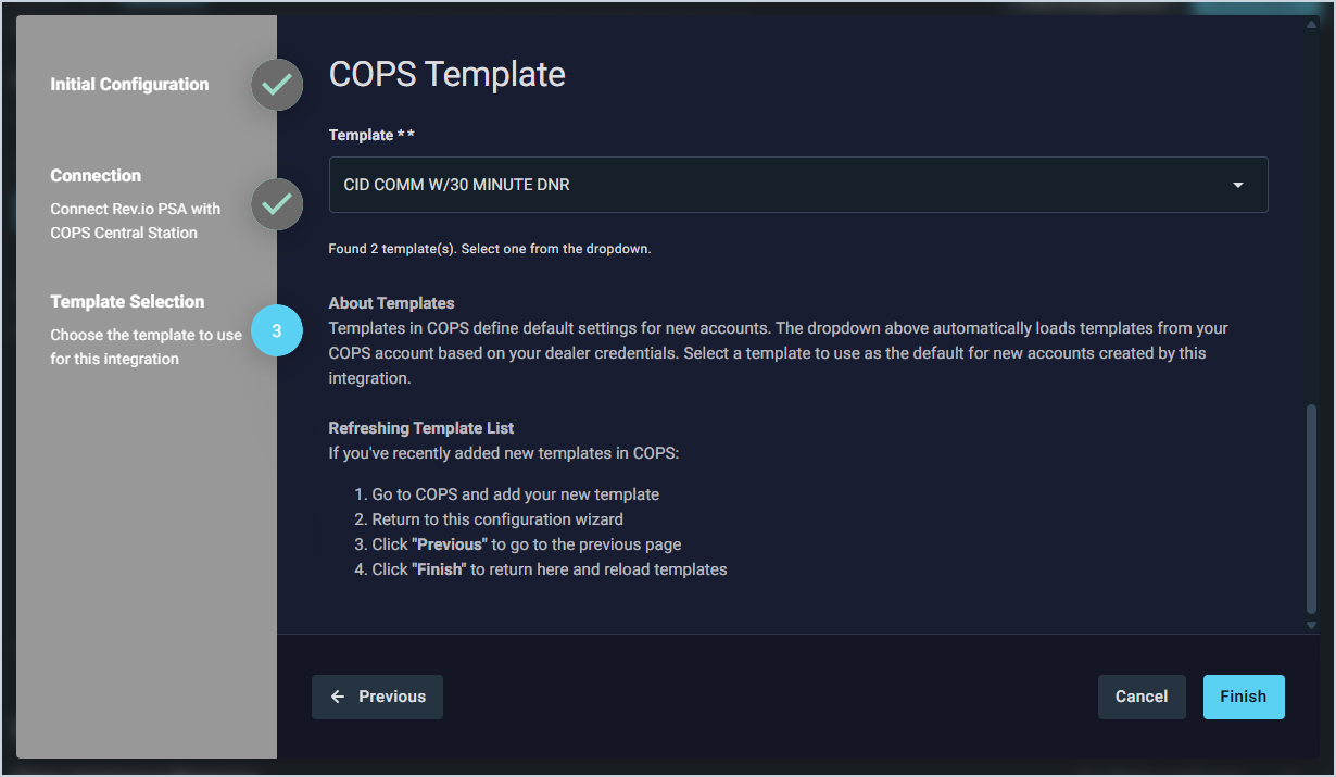 - Select the Template you want to use from your COPS account to define default settings for new customer accounts. Then, click the Finish button.