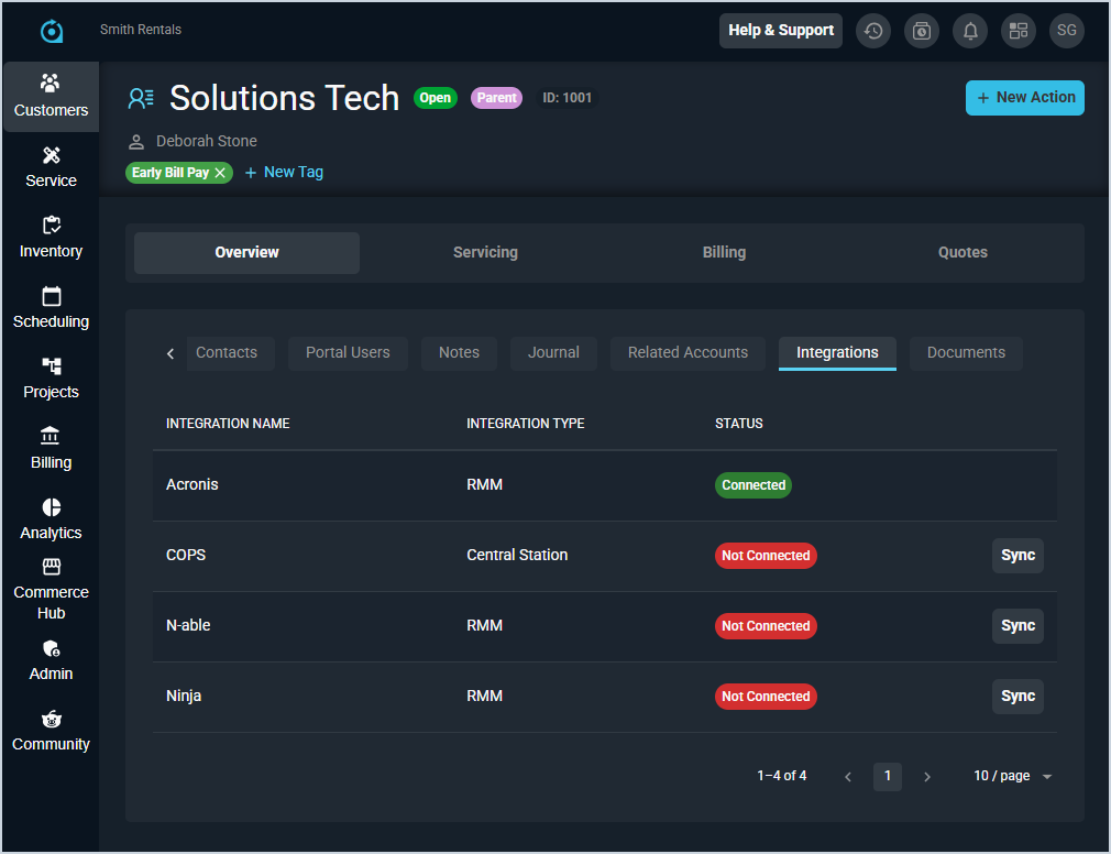 - To sync new customers with COPS, open the Integrations tab on the customer profile screen and click the Sync button for the COPS integration. To deactivate a customer's COPS sync, you'll need to remove the sync manually from both Rev.io and COPS.