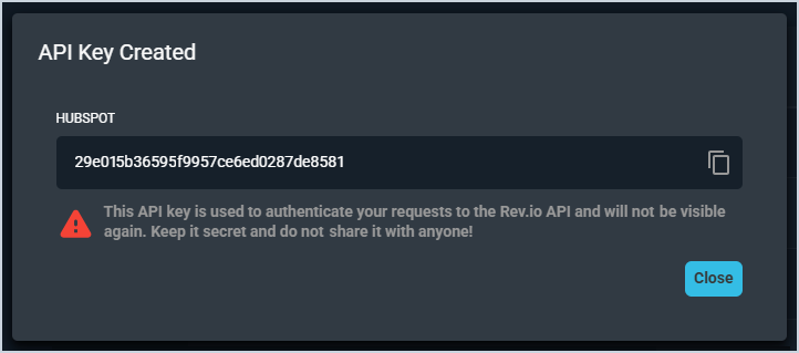 - Copy the API key for use with other applications and click the Close button when you are finished. NOTE: You will not be able to access this key again once you close this window.