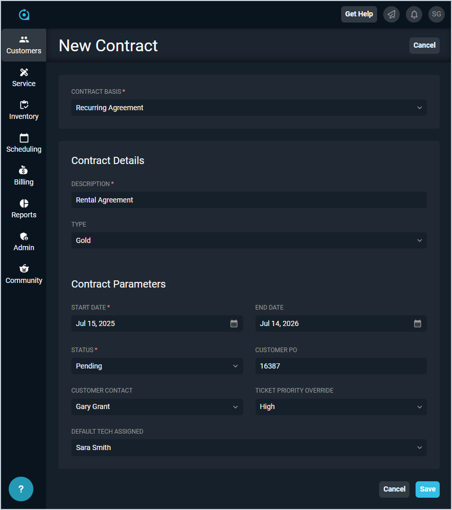 | 6 | Status | Status of the contract. Pending is the only Status option available when creating a contract. Once you add covered rate items on the Contract Rates tab and any terms, conditions, or comments on the Billing Parameters tab, you can edit the contract and change the Status to Active. NOTE: Once a contract is active, the items on the Contract Rates tab are added to the Unposted tab on the customer profile. At this time, you cannot make any changes to active contracts. |