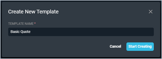 From the Quoting list view, click the Create Template button to open the Create New Template window. Then, enter a Template Name for your new quote template and click the Start Creating button.