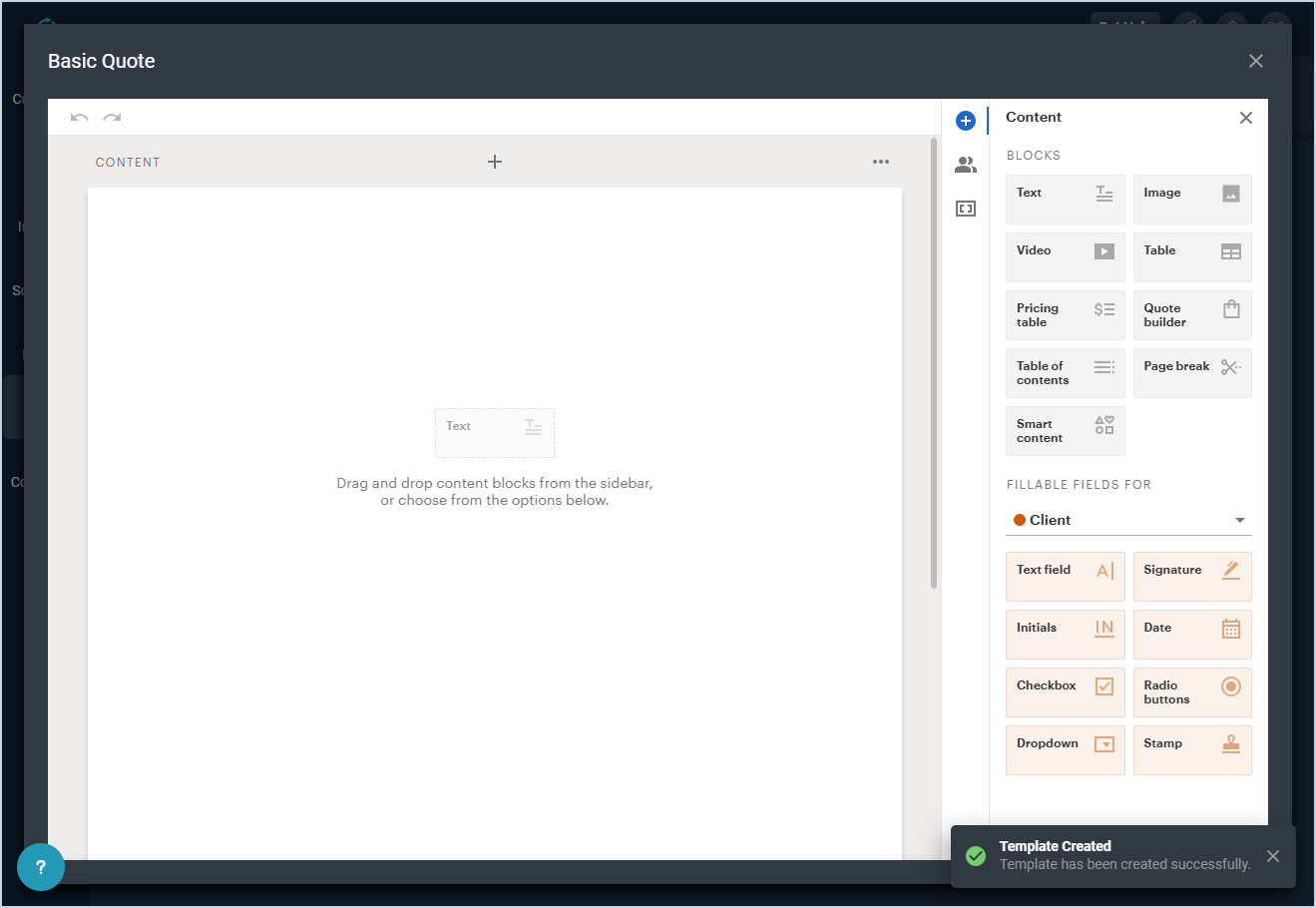 Within the quote editor, you can select from a library of quote components. Simply click a component on the Content side panel to add it to your quote template. You can drag and drop the components right where you want them.