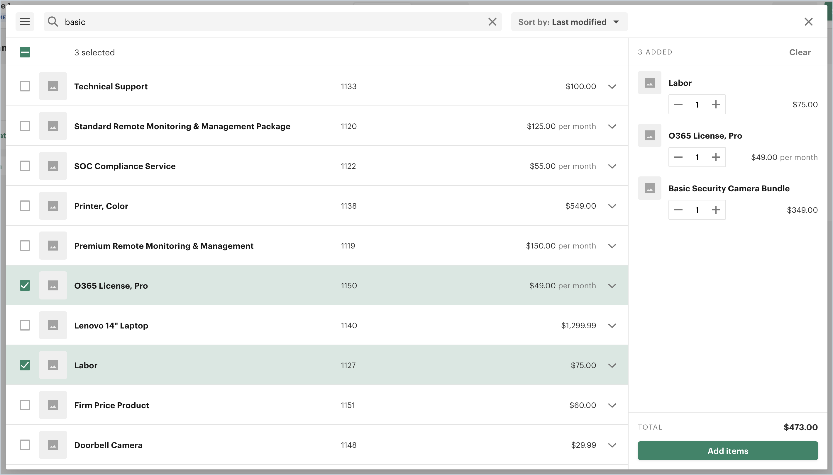 As you add the products/services, the list of items added to the quote will display on the right side of the screen. You can change the quantities of each item here if you need to, or you can edit the price and quantity later. When you have all the items you need, click the Add Items button.