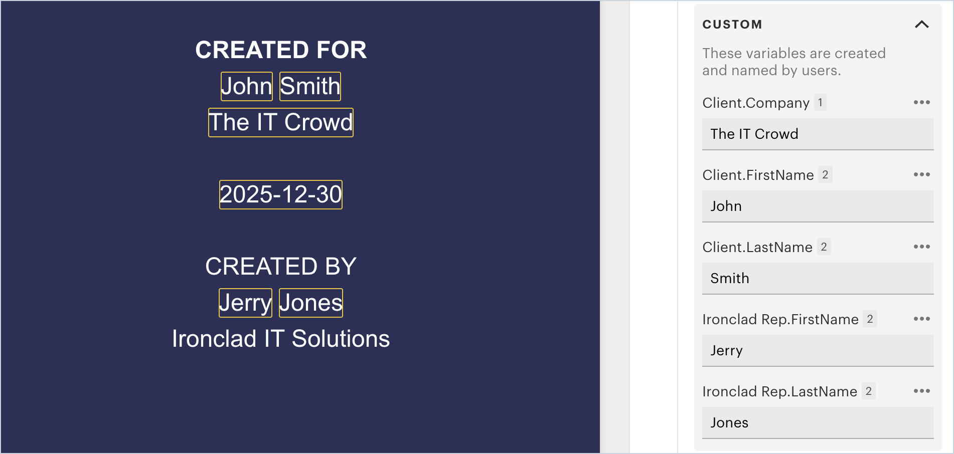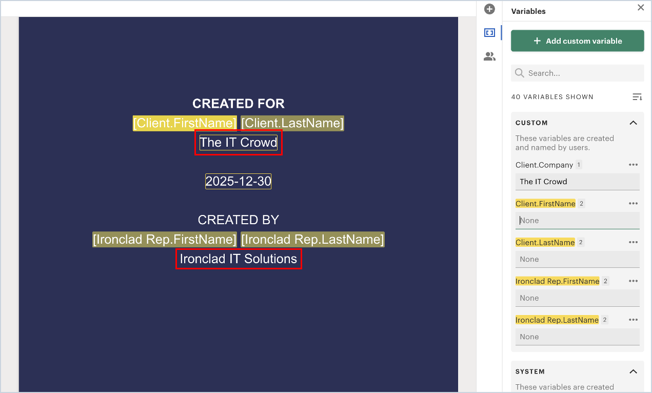 In the example below, “The IT Crowd” displays with a thin outline, indicating it is a variable that pulls from the customer account where the quote was created, whereas “Ironclad IT Solutions” was entered directly into the template as static text and does not display an outline.