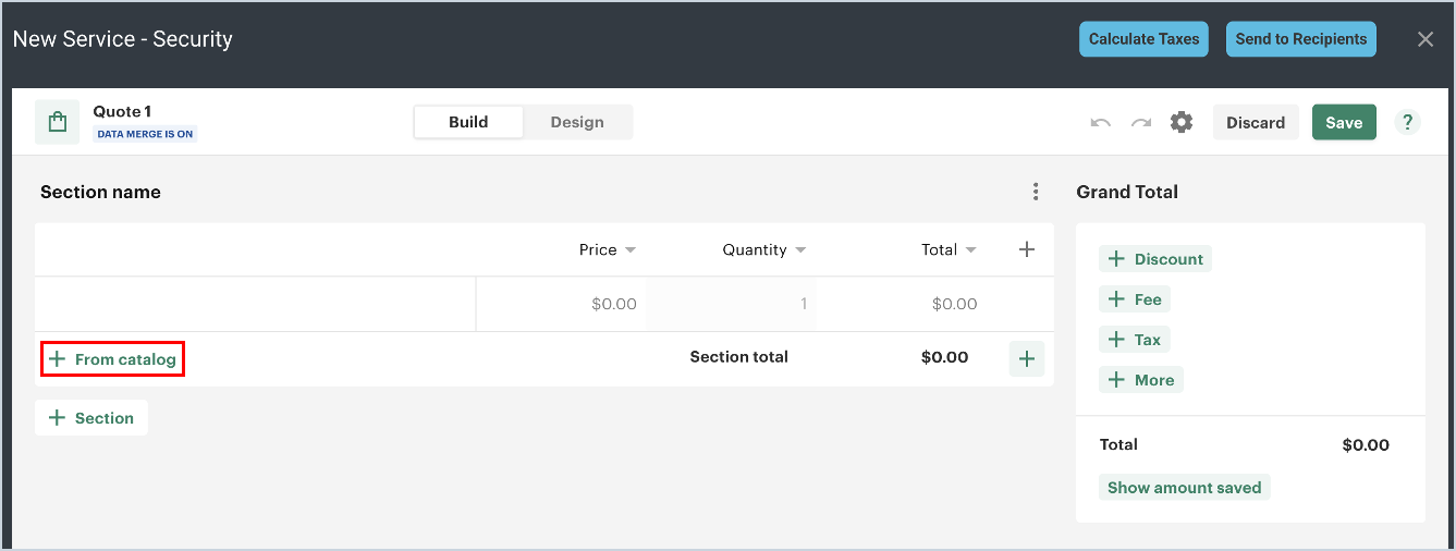 | NOTE: If a product you want to add to your quote does not yet exist in your product catalog, you will not be able to add it to the quote right away. There is a delay before that item populates in the quote editor once you've added it to your product catalog. |