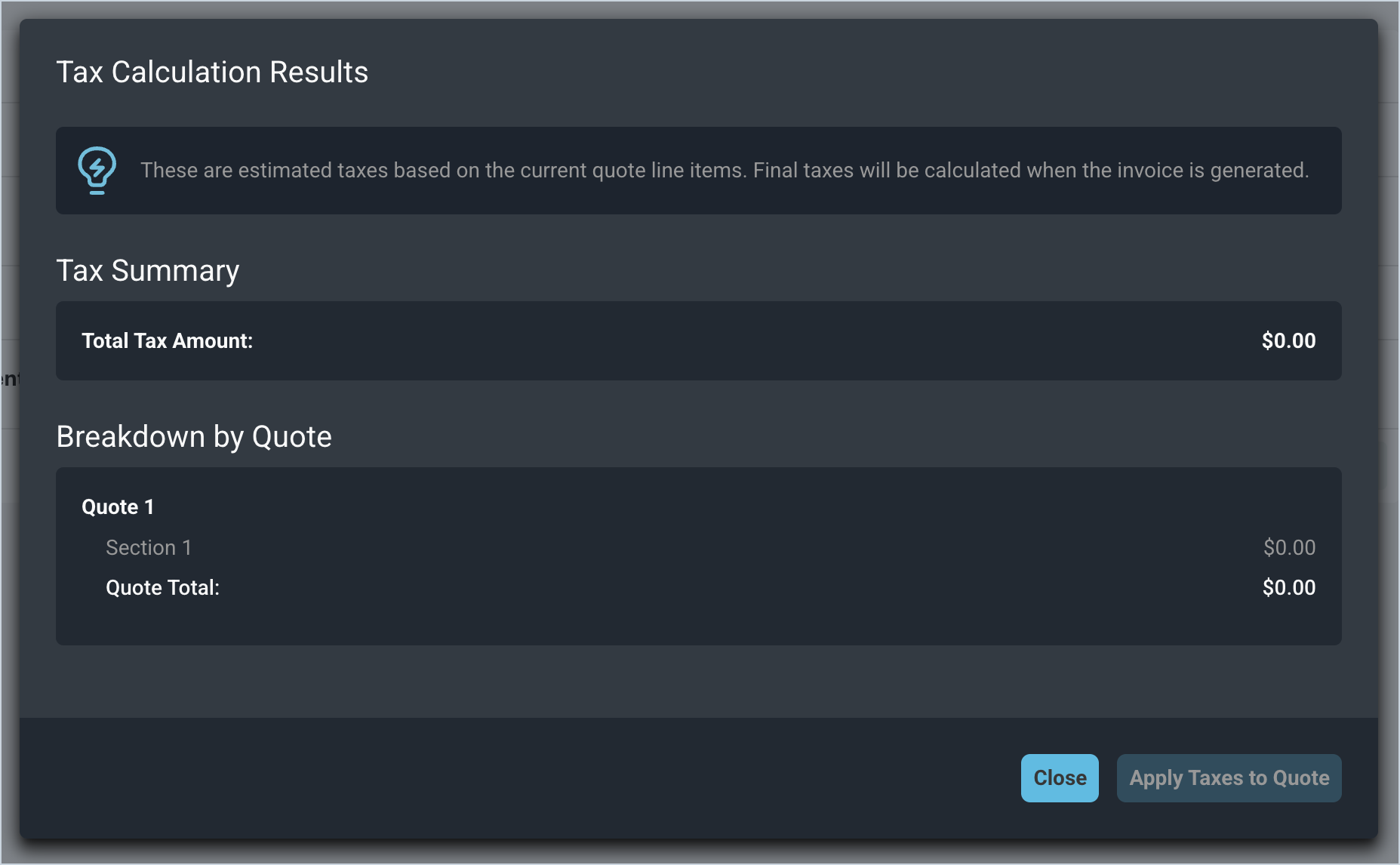 The products added to the quote (or changes to products) must be saved before you can calculate taxes on the quote. Click the Calculate Taxes button at the top to add taxes to the quote based on your configuration and the service address of the customer. Once the taxes display, click the Apply Taxes to Quote button to add them to the quote you are creating.